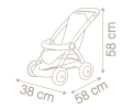 Passeggino per bambole, con piano portaoggetti e seduta in tessuto. Struttura in metallo e plastica. Il passeggino è alto 55 cm. Per bambole fino a 42 cm. Bambola non inclusa. Made in Spain