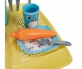 La Cucina di Bing ha tutto ciò che serve ai piccoli cuochi: lavello, piano cottura, frigorifero, forno e mensole. Include gli accessori per cucinare la riectta della Pasta Easy Peasy della serie TV: carota, piselli e pasta; pentola con coperchio, piattino, cucchiaio, bicchiere e 4 posatone. Made in France